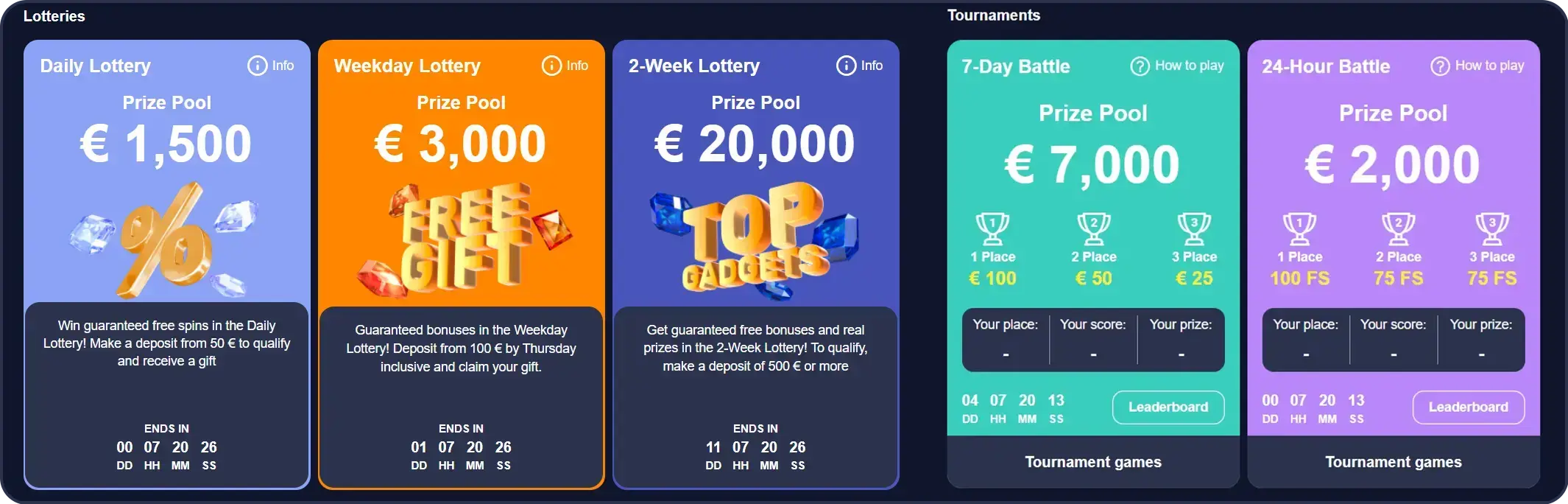 Tournaments: Weekly leaderboard-style events with prize pools of up to £5,600
